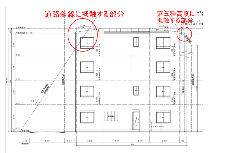 道路斜線にかかる部分は天空率緩和を適用し、専門ソフトで検証することで法規制をクリア。